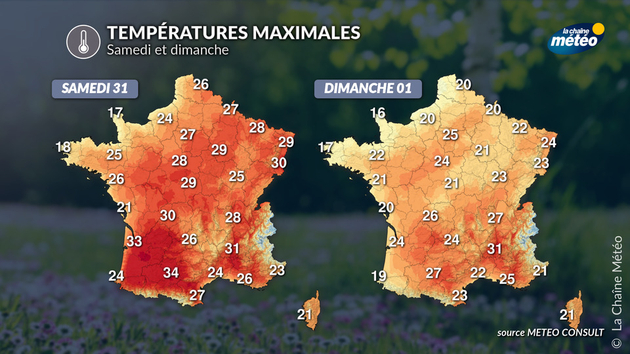 De 15 à 20°C le matin des Ardennes à la Méditerranée, on attend l'après-midi attend 24 à 30°C en général avec des pointes vers 35°C dans la vallée de la Garonne et 30°C entre Paris et Lyon.